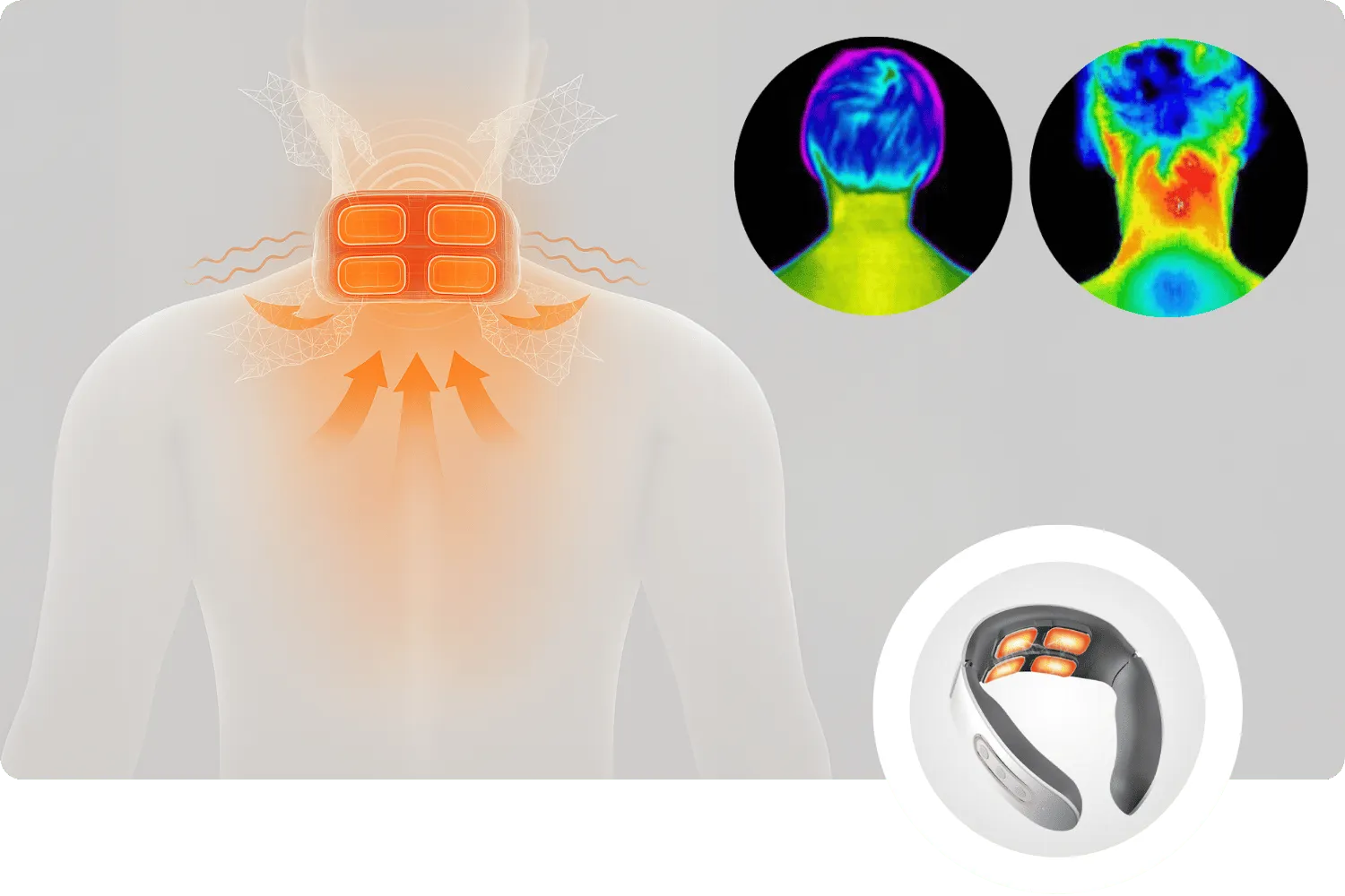 Vous ressentez une sensation de massage profond au niveau de la nuque, avec une chaleur douce. Cela peut aider à relâcher les tensions marquées et à retrouver une tête plus légère.