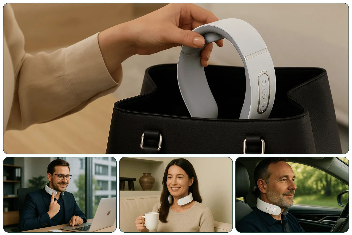 Que ce soit sur le canapé, au bureau ou en déplacement : grâce à sa grande batterie, vous pouvez utiliser Neckrest® à tout moment, facilement au quotidien. Ainsi, vous pouvez agir immédiatement dès que les gênes apparaissent.