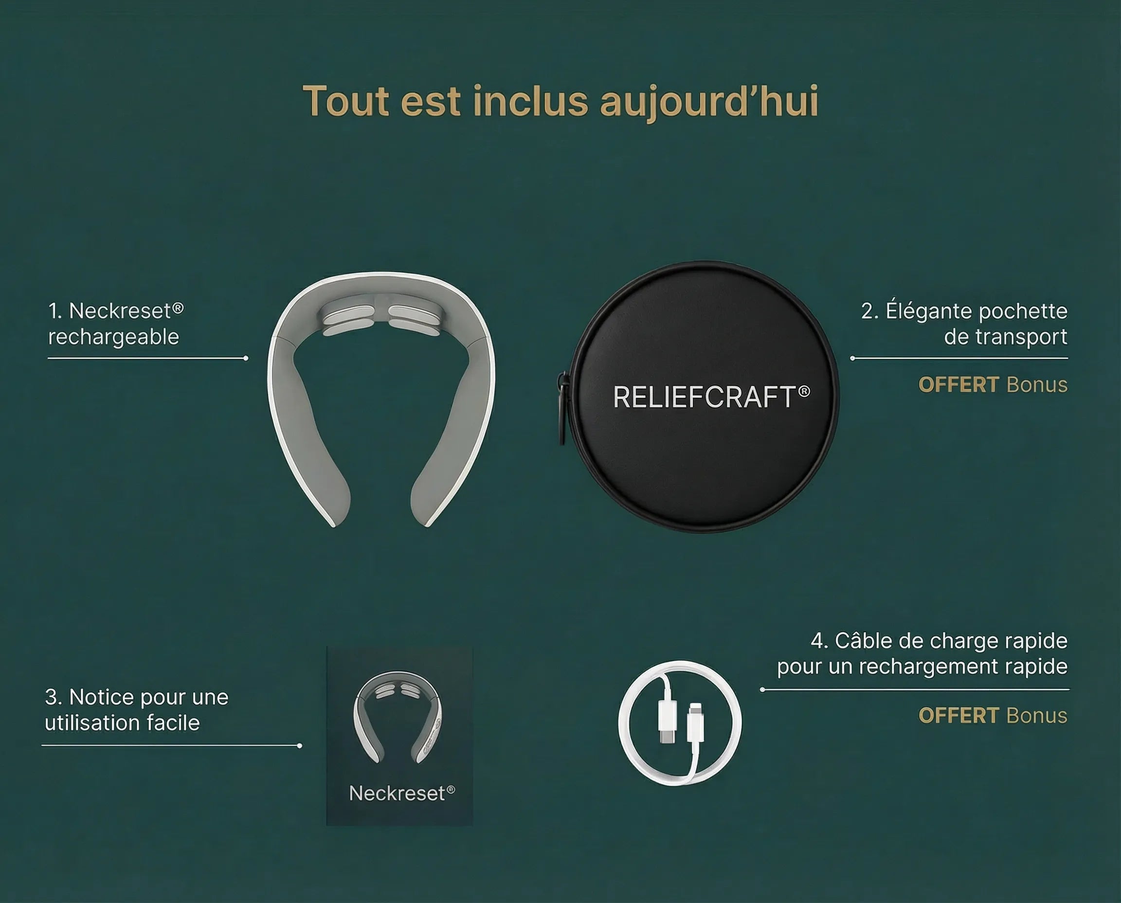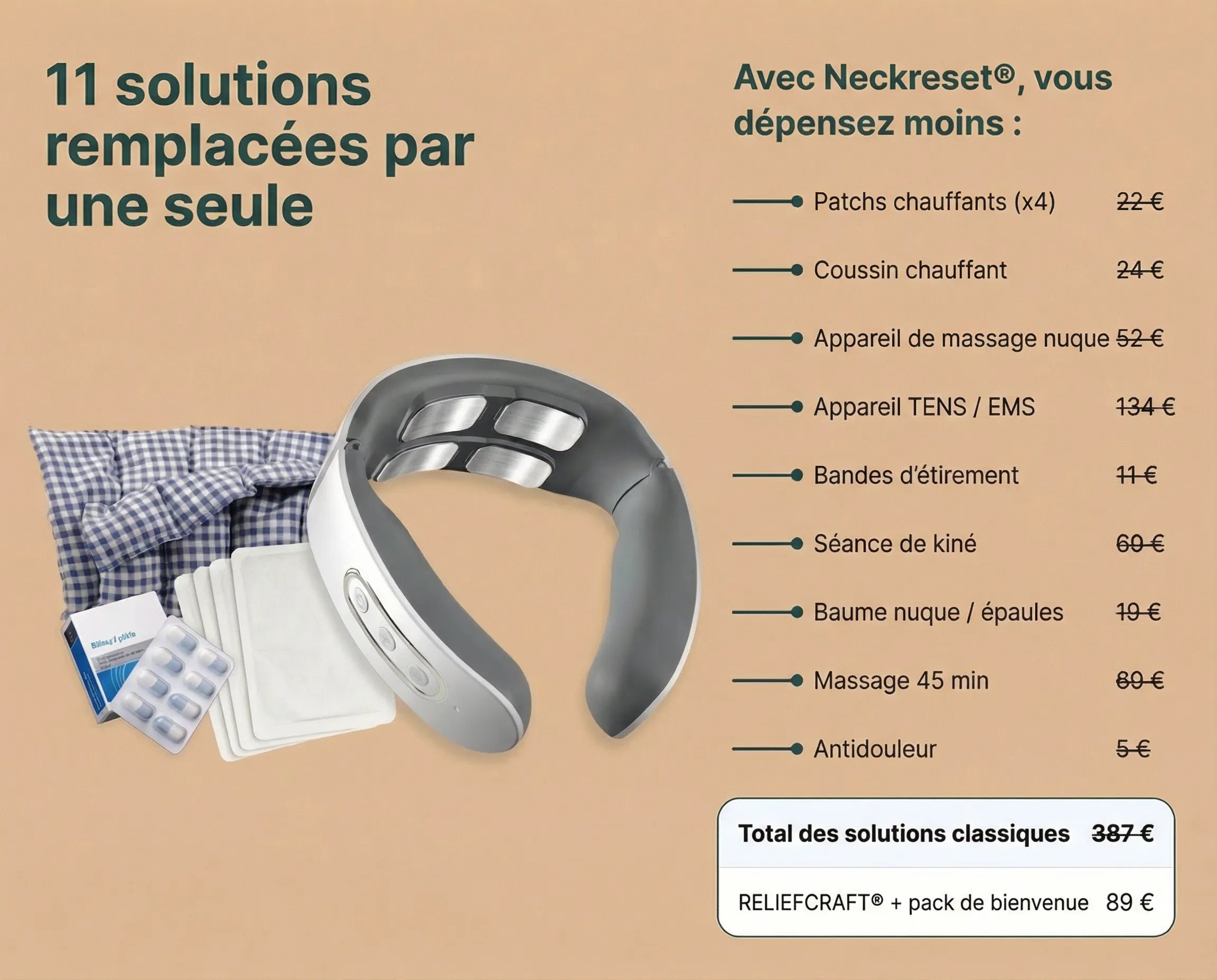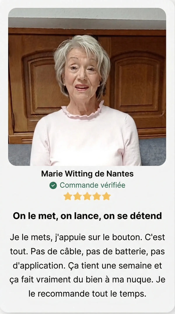Thomas H. de MontpellierIncroyable !!! Je suis bluffé !!!Je laisse rarement des avis, mais là ça les vaut. J’ai lu beaucoup de commentaires avant d’acheter et j’avais un vrai doute sur l’efficacité. Au final, le massage est parfaitement dosé : ni trop léger, ni trop fort. La chaleur est excellente aussi. J’ai régulièrement des tensions tenaces au niveau épaules/nuque, et je sens que ça va clairement m’aider à mieux gérer ça au quotidien. Mon masseur facture 50 € de l’heure : cet appareil peut vraiment faire un travail comparable à la maison. Bref, Neckrest® est parfait pour moi. Très agréablement surpris, je ne pensais pas obtenir un résultat comme ça. Recommandation claire.