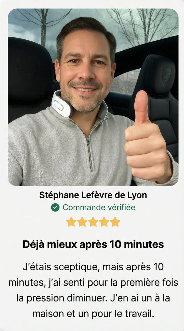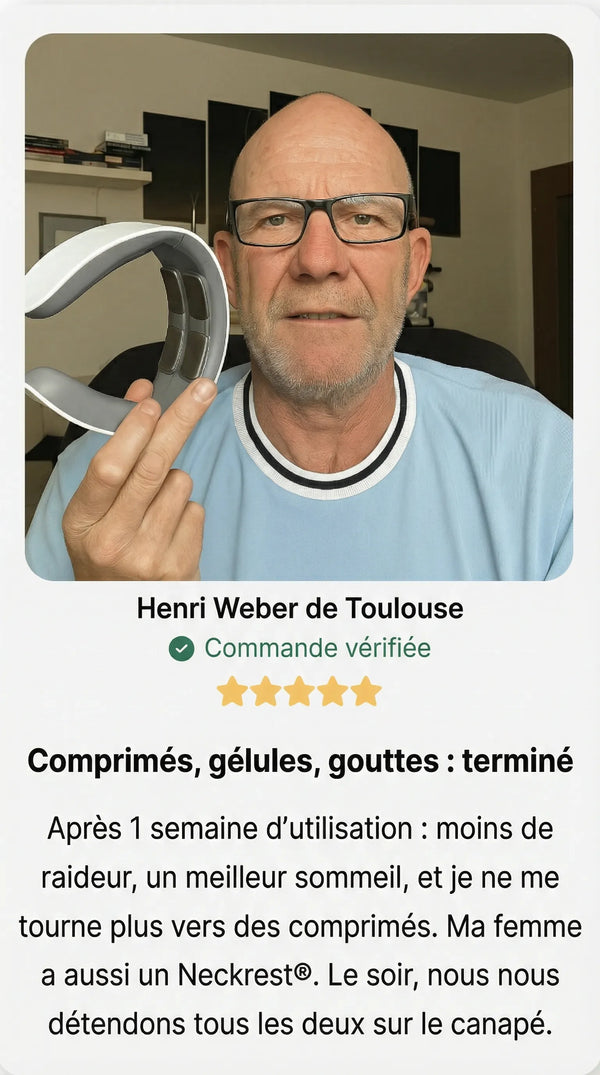 Patrick K. de StrasbourgBye bye le stress !Mon quotidien est stressant, et ma nuque l’a ressenti pendant des années. Jusqu’à avoir des vertiges au quotidien. J’ai acheté Neckrest® et j’ai été surpris de voir à quelle vitesse mes gênes se relâchent. C’est tellement simple à intégrer dans la routine : je l’utilise souvent entre deux réunions ou le soir pour déconnecter. Je ne pensais pas qu’un si petit changement pouvait faire une si grande différence.