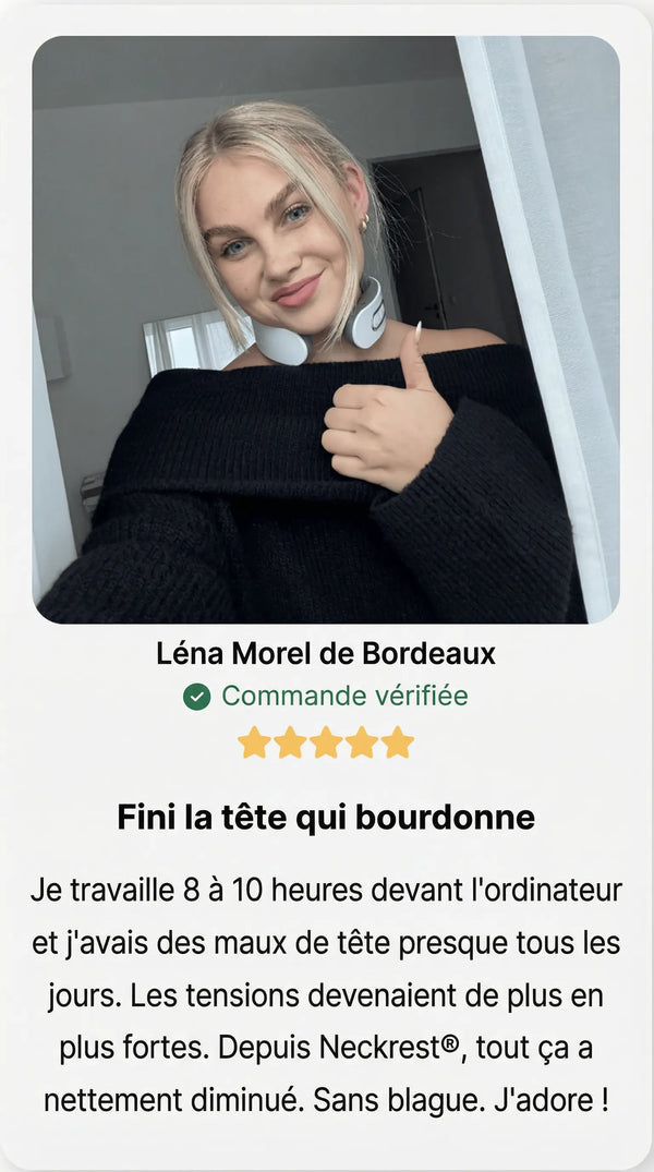Lena M. de LyonSoulagement immédiat de la douleurJ’ai pris Neckrest® parce que je devais constamment lutter contre des maux de tête. Après quelques jours d’utilisation régulière, je remarque un vrai changement. Ma nuque se sent plus détendue, et les maux de tête sont devenus moins fréquents.