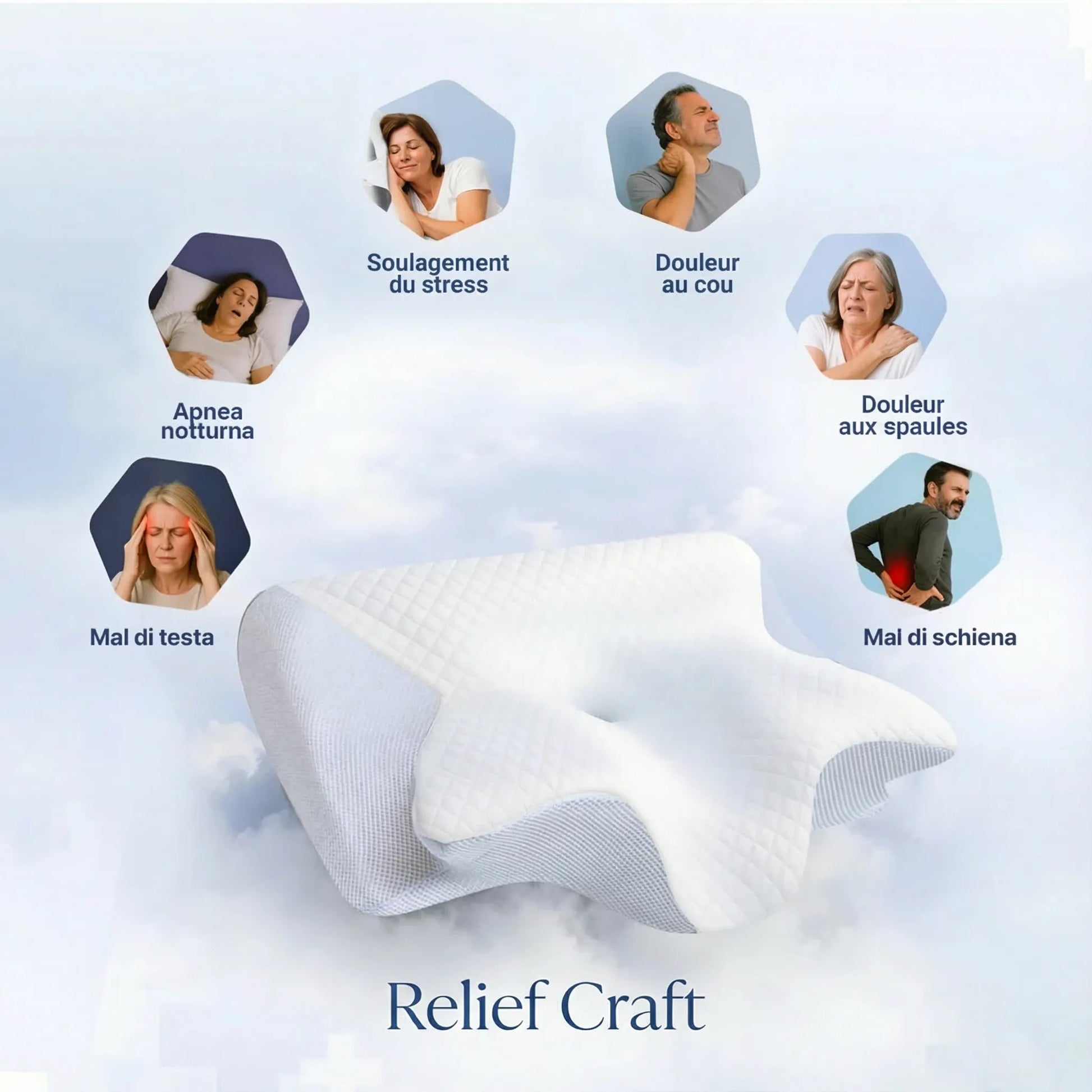 Sa forme ergonomique en papillon s’adapte à la courbe naturelle du cou, offrant un support optimal dans chaque position — sur le dos, sur le côté ou sur le ventre.