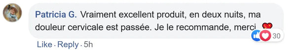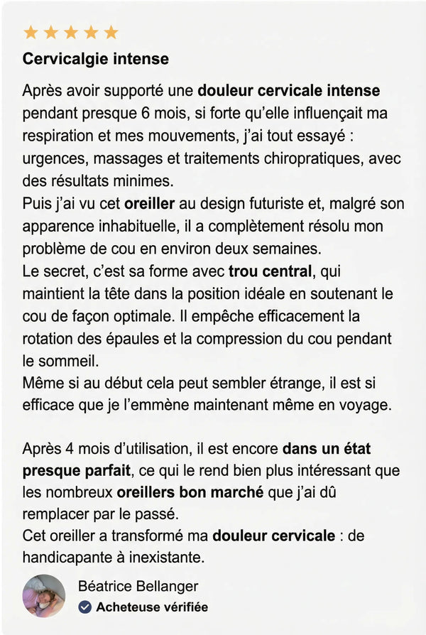Janvier 2026Lucie E.Acheteur vérifiéDouleur au cou disparue !Je suis très satisfaite de mon oreiller. Depuis que je l’utilise, la douleur au cou a disparu. J’avais un gonflement à la base du cou et maintenant il n’y en a plus. C’est top, merci.txtCopy code