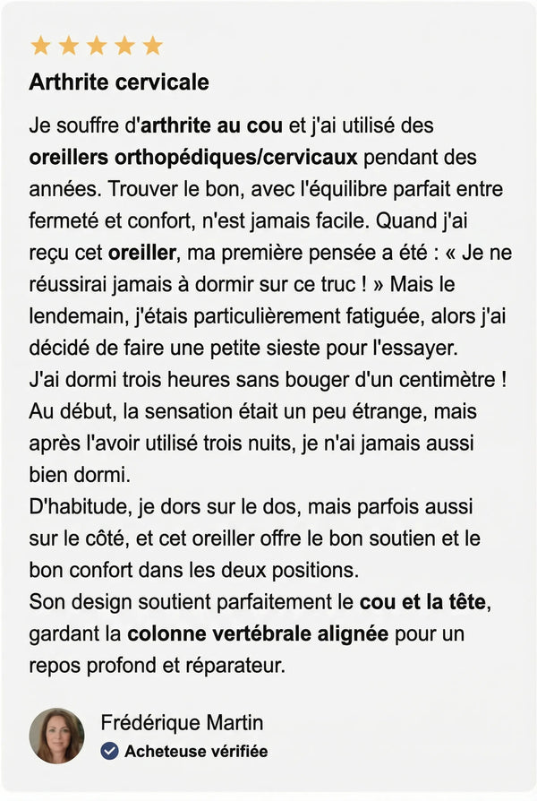 Décembre 2025Sarah B.Acheteur vérifiéAucun temps d’adaptationJ’avais peur de devoir supporter des semaines de douleurs au cou et aux épaules le temps de m’y habituer, mais ce n’est pas du tout ce qui s’est passé. Je m’endors plus vite et je n’ai presque plus de douleurs au cou et au dos. Ça a vraiment fait la différence pour moi.OrthoSleep™ – Soulagement cervical Cet avis vous a-t-il été utile ? 29 0