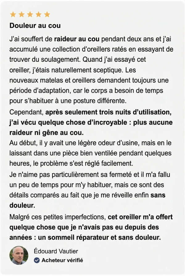 Je n’en attendais pas grand-chose au départ. Finalement, il a vraiment fait la différence : je dors mieux et les douleurs au niveau du cou ont nettement diminué.