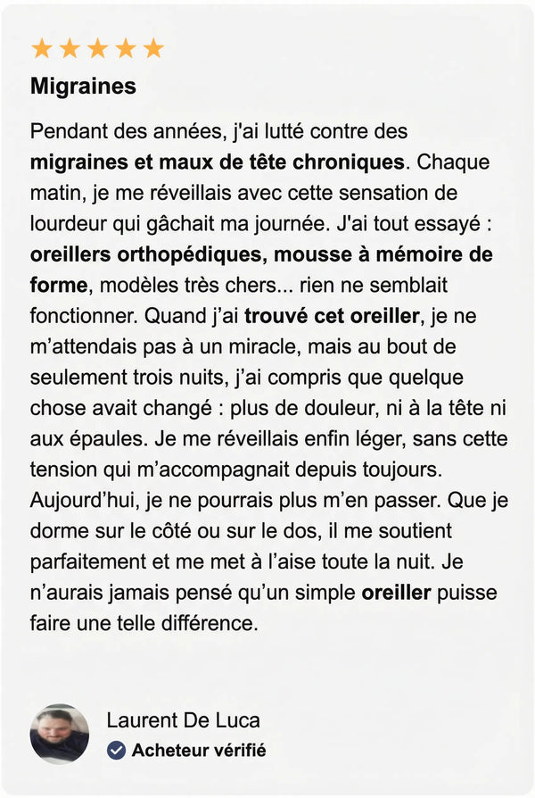 Décembre 2025Françoise P.Acheteur vérifiéLe meilleur oreiller pour mon mari!Enfin un oreiller qui soulage vraiment la douleur au cou. Mon mari souffrait depuis des années, après quelques jours d’utilisation, il m’a dit que c’était le meilleur oreiller qu’il ait jamais essayé. Il n’a plus de douleurs pendant la nuit. Ça fait vraiment la différence. Nous le recommandons vivement !